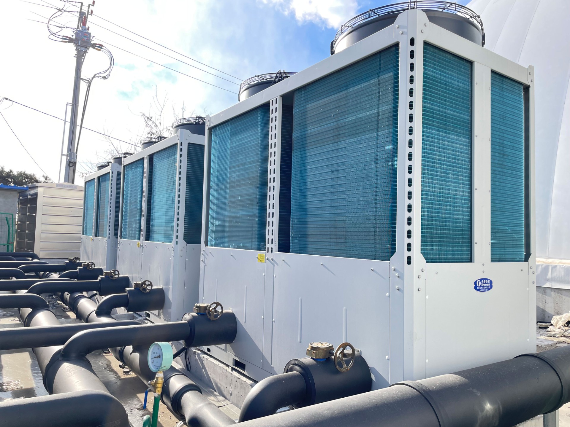 天舒為大東氣膜體育館提供了7臺60HP空氣源熱泵機組,在寒冷的冬季機組也照常平穩(wěn)運行,整套系統(tǒng)設備節(jié)能環(huán)保,智能運行。建設以來,系統(tǒng)安全穩(wěn)定,場館舒適健康。新風系統(tǒng)保證館內的空氣始終流通,毫無悶熱感,滿足沈陽運動愛好者對體育場館的所有要求。無論天氣如何變化,大東氣膜體育館永遠是讓人舒服的運動環(huán)境。
