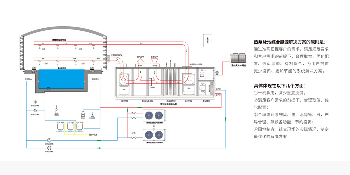 根據(jù)學(xué)校泳池具體情況,如尺寸大小、建筑結(jié)構(gòu)、使用時間、熱水需求、空調(diào)需求等等,優(yōu)化方案,打造高能效系統(tǒng),減少能耗。
