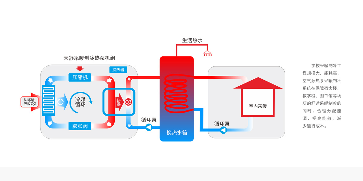 根據(jù)教學(xué)樓、宿舍、圖書(shū)館等設(shè)施的采暖制冷時(shí)間,制定方案,合理選型,減少成本。