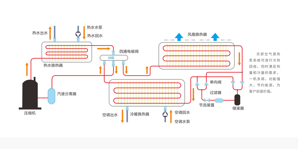 在休閑餐飲行業(yè),比如夏季酒店,需求生活熱水的同時(shí),也需要房間制冷,熱泵可將房間熱量收集用于制熱水,同時(shí)制取冷熱水,一機(jī)多用,高效節(jié)能。